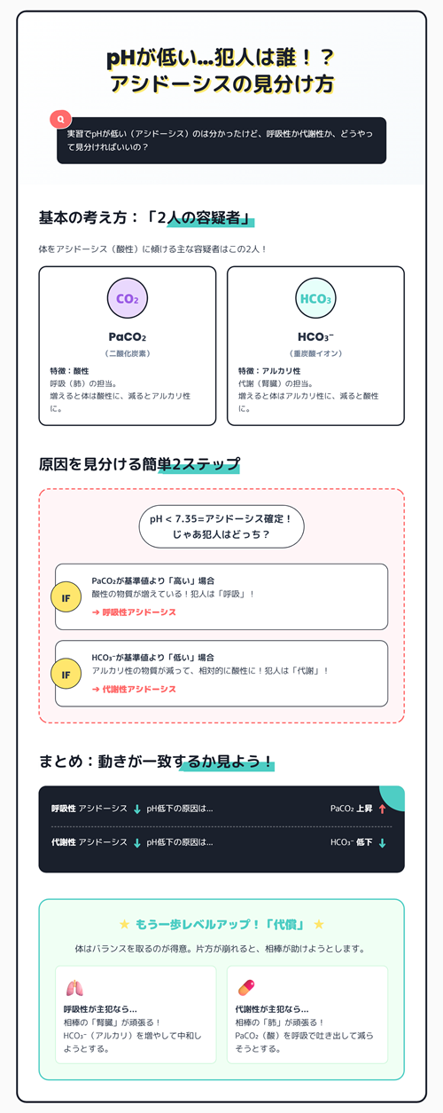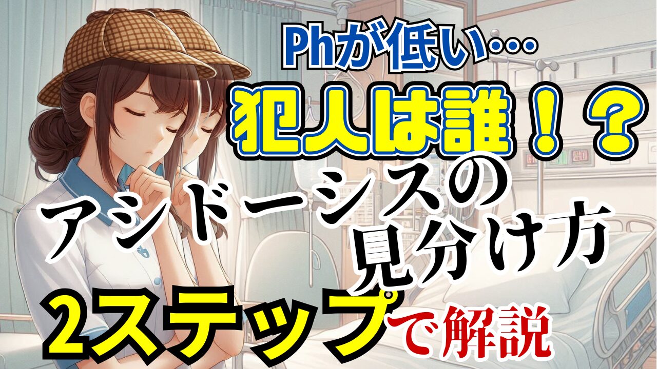 pHが低い…犯人は誰!?アシドーシスの見分け方、2ステップで解決!