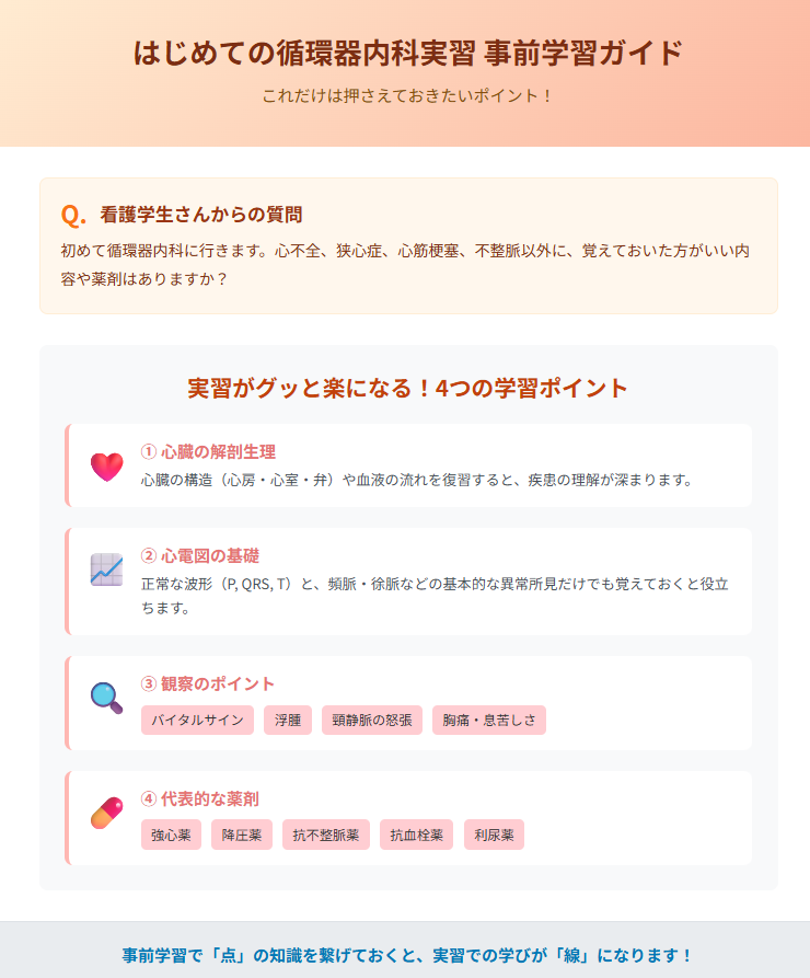 事前学習として心不全、狭心症、心筋梗塞、不整脈を復習していますが、他に覚えておいた方がいい内容や薬剤があれば教えてください。