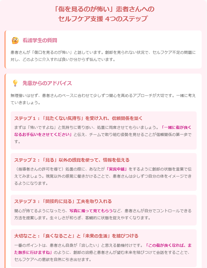 少しずつ関心が持てるようになってきたら、患者さんが自分でコントロールできる方法で「間接的に見る」工夫を提案してみましょう。例えば、写真に撮って見てもらうことで生々しさが少し和らぎ、客観的に状態を捉えやすくなります。