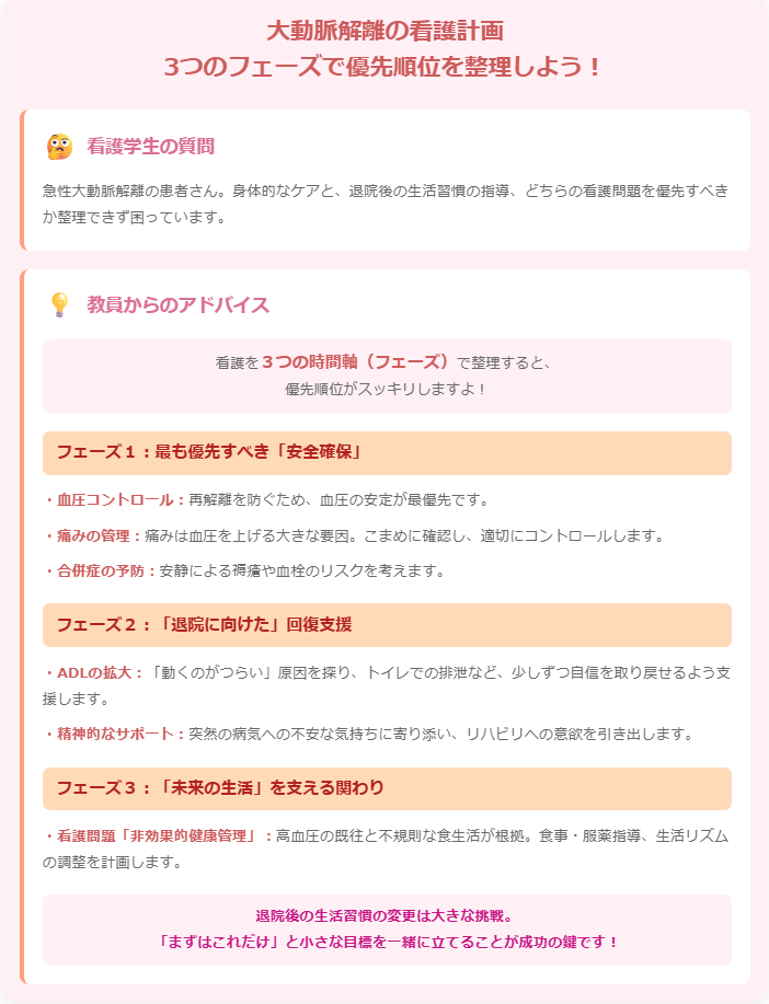 この患者さんの看護を考える時、大きく分けて3つのフェーズで優先順位を整理すると頭がスッキリしますよ。
