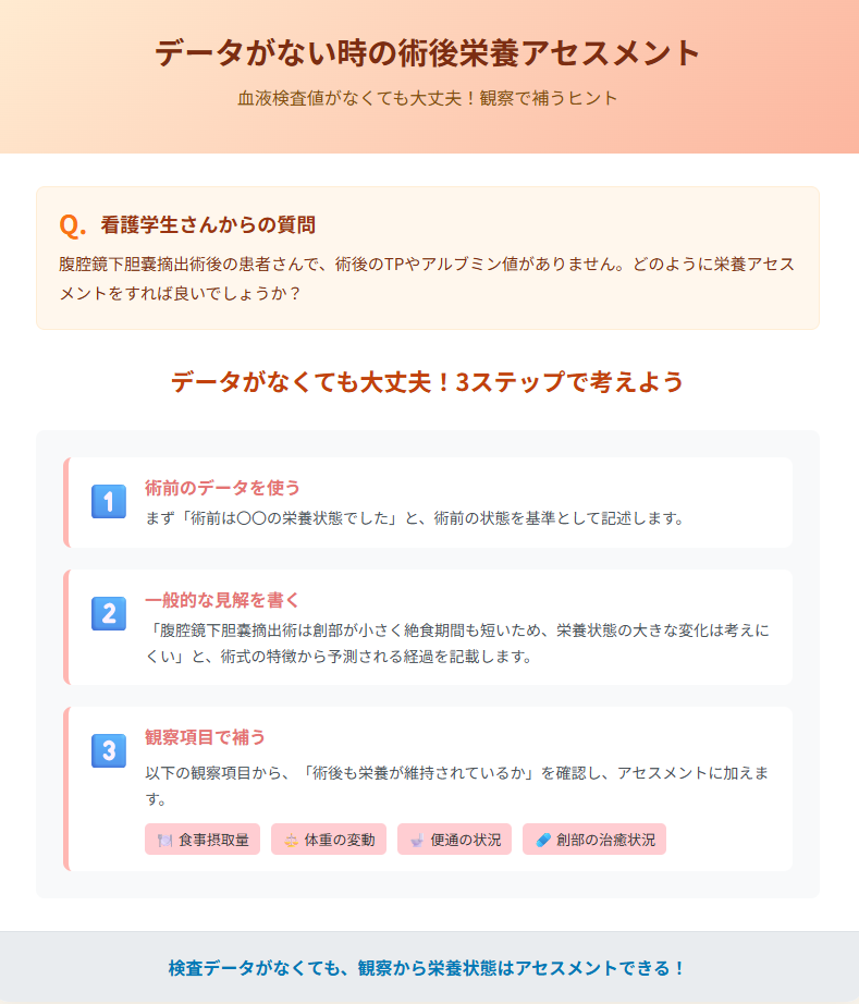 さらに、術翌日から開始する食事の実際の摂取量、体重の変動、便通、創部の治癒状況などを観察項目に加えて、「術後も栄養が維持されているか」を確認すると、血液検査値がなくても栄養アセスメントができますよ。