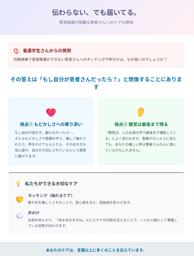 思う事があっても言いたい事があっても相手に伝えられない、やりたい事があっても体を動かす事が出来ないなど様々なもどかしさや葛藤を抱きながら過ごしている中で、看護師さんに優しくタッチングしてもらったり声をかけてもらったりしたらどうでしょうか?