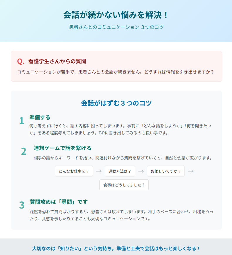 患者さんの情報収集をする時にコミュニケーションが大切だという事は分かっていますが、コミュニケーションを取ることが苦手で会話が続きません。