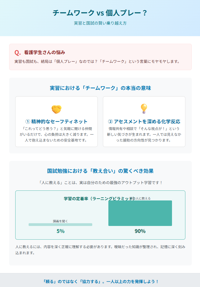 看護2年生です。領域実習が始まりました。表向きでは「実習はチームワークが大切」と言われていますが、受け持ち患者さんは一人ひとり違うし日々の記録や最終的な評価も個人でされるので、結局は「個人プレー」なのではないかと感じています。また、国家試験の勉強についても友達と教え合う時間がもったいなく感じて、その分自分で調べたり問題を解いたりした方が効率が良いのではないかと思ってしまいます。相手の時間を奪ってしまうことにも少し罪悪感を感じますし…。