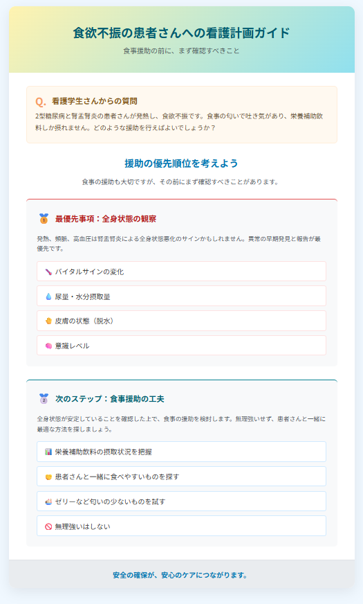 無理に食べさせようとするのではなく、栄養補助飲料の摂取状況を把握し、患者さんが受け入れやすい食形態を一緒に模索することで、最適な援助方法を見つけるよう努めましょう。