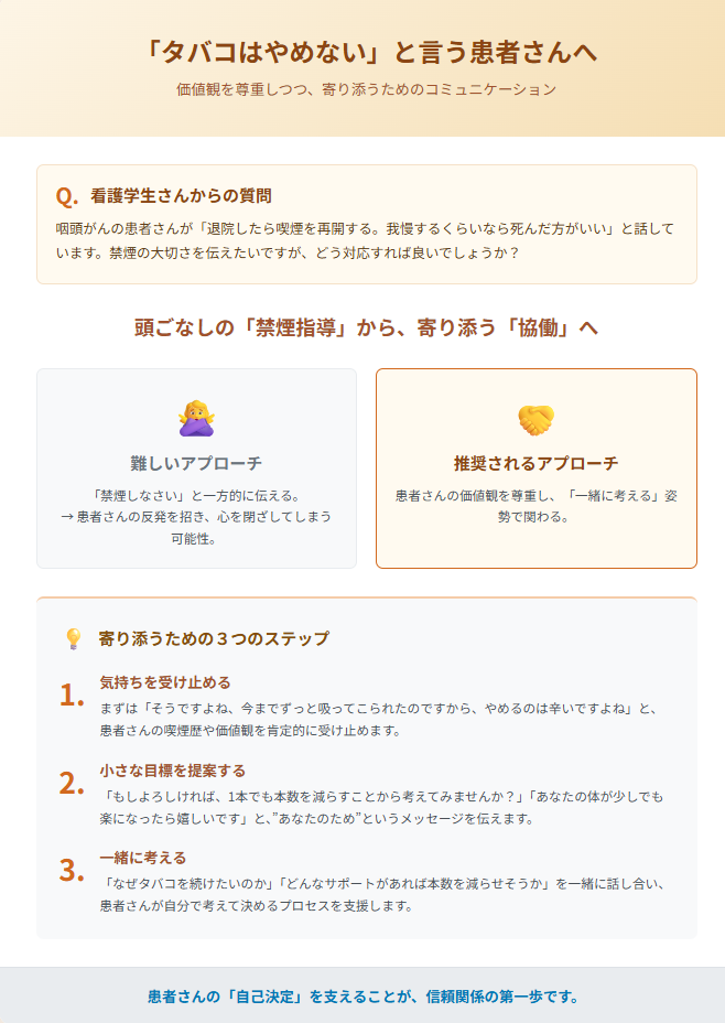 喫煙が咽頭がんの再発や他のがんのリスクを高めると伝えたところ「我慢するくらいなら死んだ方がいい。」とか「無理に生きようとは思わない。」と話していたので、どう対応すればいいかわからず困っています。