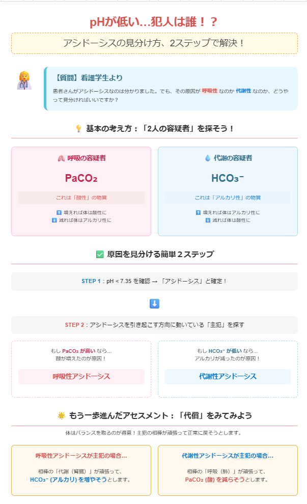 実習で受け持っている患者さんの血液ガスデータを見て、pHが基準値より低く、アシドーシスだというのは分かったのですが、どのようにして呼吸性のアシドーシスか代謝性のアシドーシスなのか見分ければいいのですか?