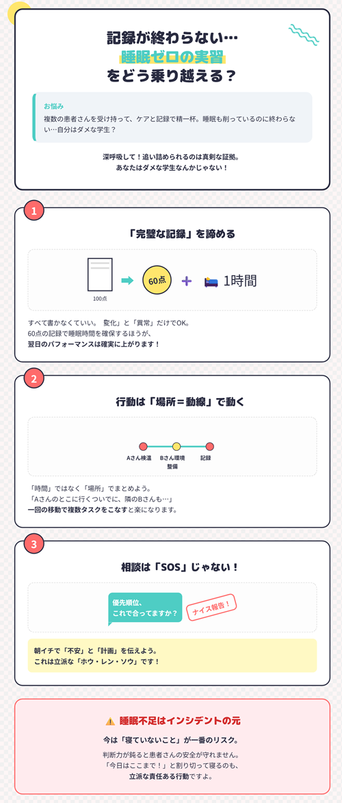 「記録が終わらず睡眠ゼロ…」は、統合実習で受け持ちが複数になり“多重課題”に切り替わったサインです。統合実習を乗り越えるために「完璧な記録を手放す」「動線で行動調整」「朝イチで優先順位を相談」の3つで整理します。