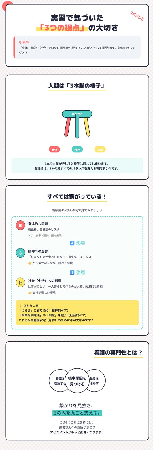 指導者さんが問いかけたかったのは、この「繋がりを見抜き、その人全体を丸ごと支える視点」のことだと思います。これがまさに「全人的なケア」の本質であり、看護師ならではの素晴らしい専門性なんですよ。