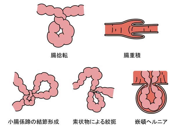 ・痙攣性イレウス:強い痛みや薬物中毒などにより腸管の過度な収縮(痙攣)が起こり、内容物が通過できなくなった状態。